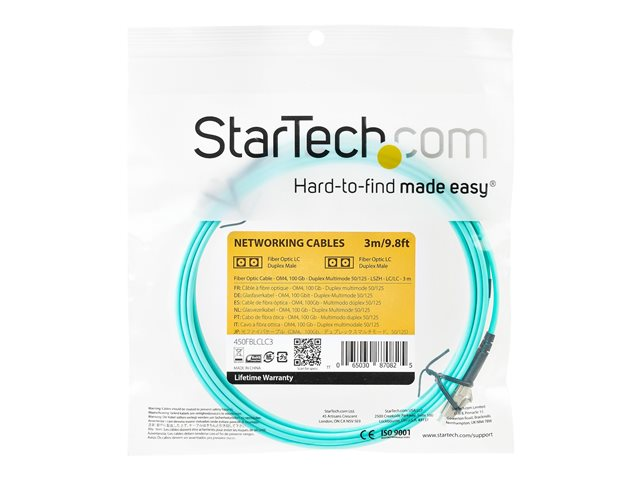 StarTech.com Aqua OM4 Duplex Multimode Fiber - 3m/ 9 ft - 100 Gb - 50/125 - OM4 Fiber - LC to LC Fiber Patch Cable (450FBLCLC3) - Nettverkskabel - LC multimodus (hann) til LC multimodus (hann) - 3 m - 3 m - fiberoptisk - dupleks - 50 / 125 mikroner - OM4 - akvamarin