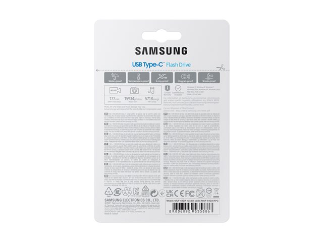 Oppdag Samsung MUF-64DA USB-minnepinne, en pålitelig løsning for lagring og overføring av digitalt innhold. Denne minnepinnen er designet for å dekke behovene til brukere som krever holdbarhet og hurtighet, og har en robust konstruksjon som er motstandsdyktig mot røntgenstråler, magneter, støt, ekstreme temperaturer og vann. Enten du jobber profesjonelt og har behov for å transportere viktige dokumenter på en sikker måte, eller du er en eventyrer som ønsker å ta vare på minnene dine, vil denne minnepinnen takle utfordringene. USB-C 3.2 Gen 1-grensesnittet sørger for raske dataoverføringshastigheter på opptil 300 MB/s, slik at du kan flytte filer raskt og komme tilbake til det som er viktigst. Med hele 64 GB lagringsplass har den plass til store mengder data, fra høyoppløselige bilder og videoer til musikkbiblioteker og viktige dokumenter. Samsung MUF-64DA er ikke bare en minnepinne, men en følgesvenn i ditt digitale liv som sørger for at dataene dine alltid er innen rekkevidde og beskyttet.