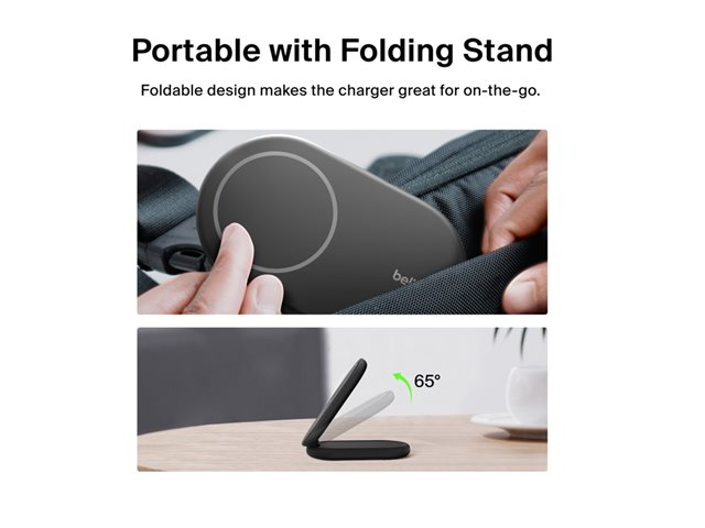 Belkin BoostCharge - Trådløst ladestativ - magnetisk, sammenleggbar, med Qi2 + AC-strømadapter - 15 watt - 3 A - Fast Charge, Power Delivery 3.1 - svart