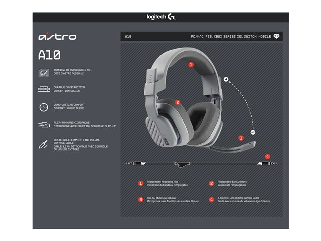ASTRO Gaming A10 Gen 2 - Hodesett - full størrelse - kablet - 3,5 mm jakk - grå 939-002071