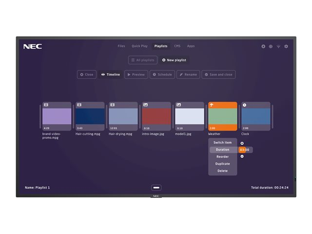 - Everything under control - one single interface is needed to manage both the NEC MediaPlayer and the display directly, via a web-interface or the NEC Display remote control