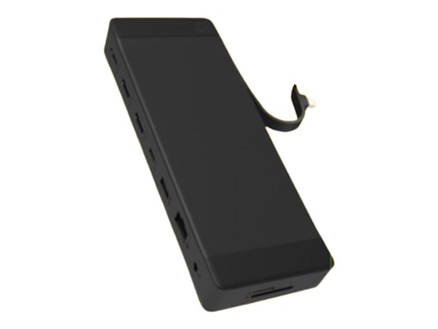 The ZAGG docking station enhances connectivity and simplicity for any workspace. It features an integrated USB-C cable that provides a reliable connection while allowing for Power Delivery up to 100 W, ensuring devices stay charged and ready for use. With multiple interfaces including network, audio/video, and various USB types, this docking station provides connectivity options for peripherals and displays.